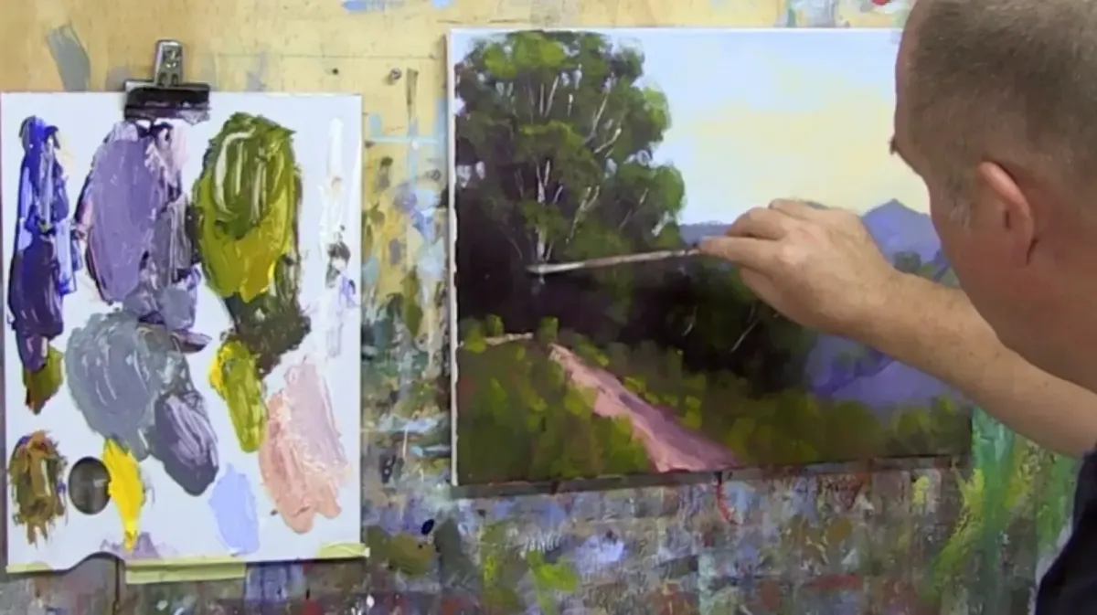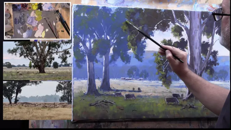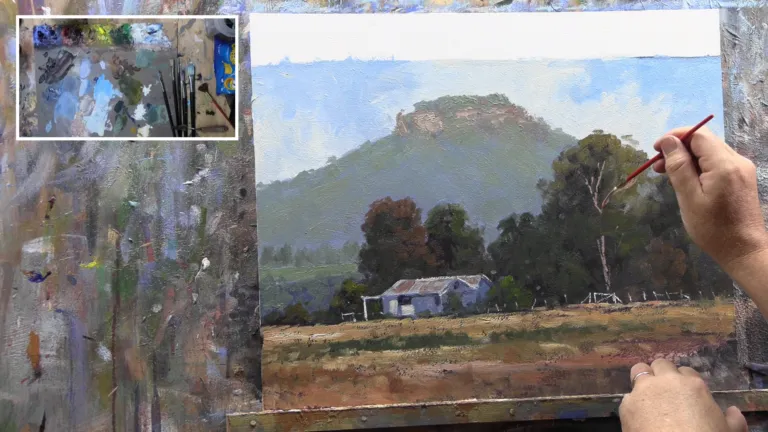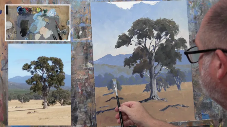 In week 4 we start to look at the all important concept of Aerial Perspective. In order to have your landscape paintings take on greater depth and atmosphere there are certain keys we can apply that build a sense of Aerial Perspective. And we complete a more complex landscape in which we have both a lot of depth and atmosphere, and a more complex element in the main tree.